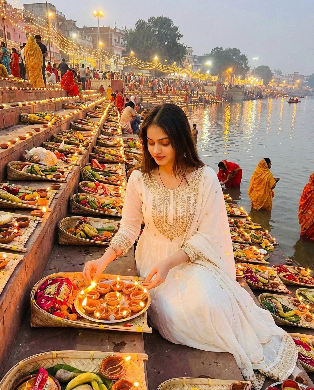 Create an imade of chath puja celebration a festival of bihar  use the image provided of this girl above she is sitting on the stairs of the ghat lightening tray full of diya for the soup and the picture is of evening aradh where stairs are full of soups for aradh  streets and ghats are full of lights. She's wearing a white anarkali suit with thread details on neck pinteresty asthetics and has open silky hair. This picture is full of grace and emotion towards the festival.