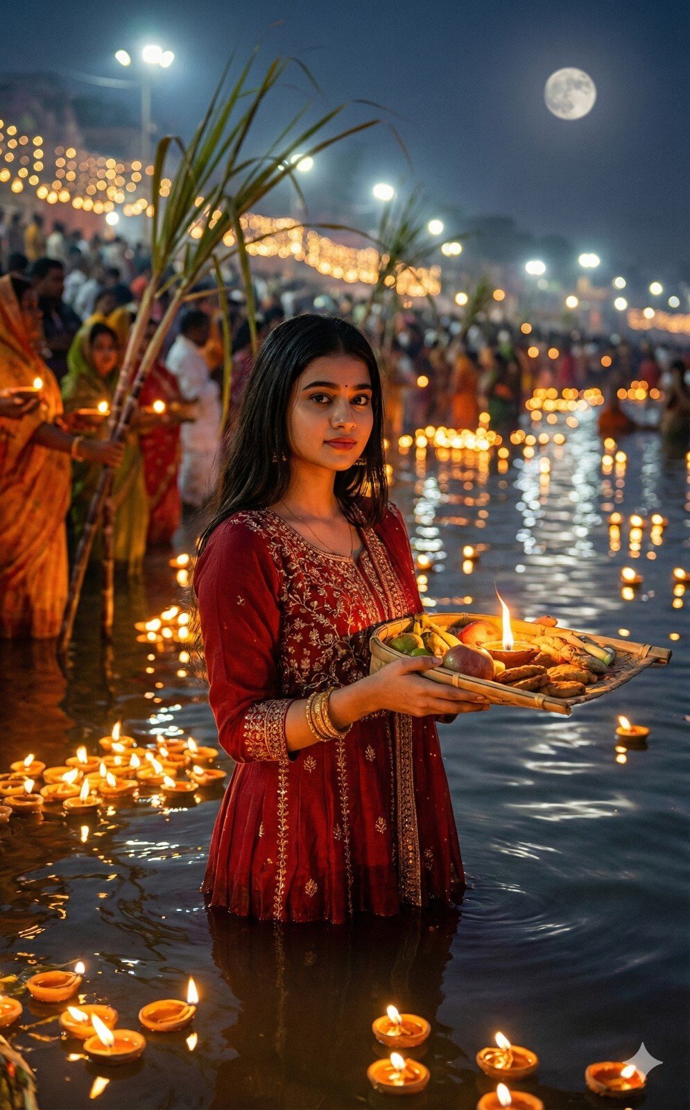 Create an image of chath puja celebration a festival of bihar.This picture is of evening and use the image provided of the girl where shes holding the rectangle bihari traditional soup full of fruits thekua diya and standing seating in the water at the ghat her hair is open and she's full of gratitude and devotion. Ghats are all decorated with lights and soups for chath puja and for celebration.She's wearing cherry red banarasi silk saree with jewelry pinteresty has open silky hair.