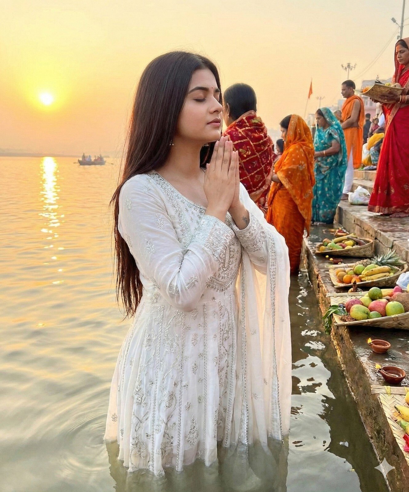 create an image of chhath puja celebrate festival of bihar use the image of provided of this girl above who praying of surya dev with folded hands standing in water and showing devotion she wearing a White colour of suit with thread details Pinterest aesthetic and has open straight long hair this picture of fully of grace and emotion towards the festive.