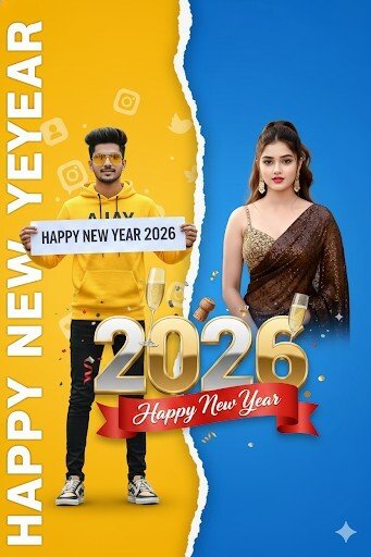 “New Year poster with my two photos, left side yellow IG-profile background, right side blue clean background, white torn-paper divider, 2026 metallic numbers, red Happy New Year ribbon, champagne elements, vertical HAPPY NEW YEAR text, bright and stylish.