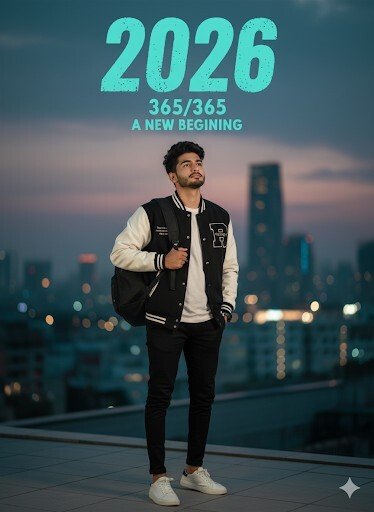 A cinematic portrait of a stylish man, standing one hand in his pocket and the other holding the strap of his backpack, looking slightly upward as if embracing new possibilities. Wears varsity jacket, white Tee, tapered black joggers, and clean white sneakers. Above him, large stylized text reads: "2026" in a bold, slightly distressed teal font, with smaller text below: "365/365" and "A NEW BEGINNING". Cinematic photography style, highly detailed, soft lighting, dreamy atmosphere,New Year theme.
