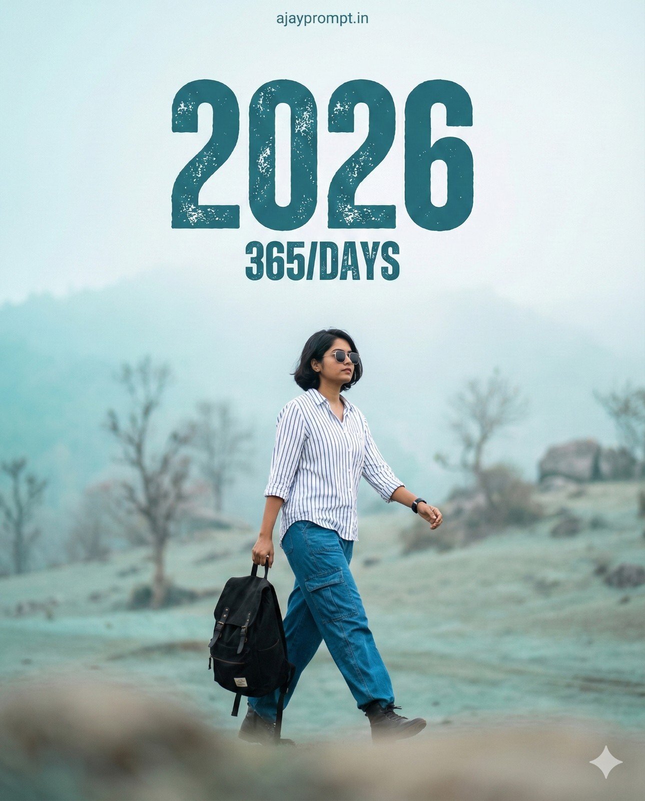 A photorealistic cinematic shot of a young Indian woman walking confidently from left to right across a soft blurred foreground, she is wearing sunglasses, a white and blue striped button-down shirt, blue cargo pants, holding a black backpack in her left hand, background is a misty ethereal landscape dominated by muted teal blue and light gray tones, cinematic lighting, highly detailed, 8k, new year theme, Overlay text design: large bold slightly distressed teal font reading "2026", smaller text below reads "365/DAYS", small text at very top reads"ajayprompt.in" --ar 4:5-v 6.0-style raw.