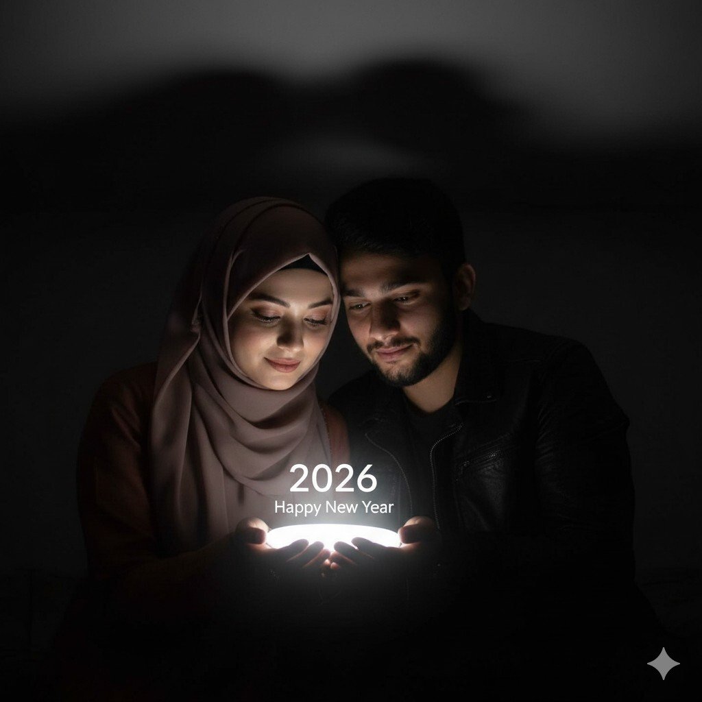 A Muslim couple sitting closely together in a dark room, bothilluminated dramatically from below by a glowing light cupped in theirhands. The glowing light displays the text "2026 Happy New Year" in bright white. The girl is wearing an elegant hijab, and the man has a short beard. Their expressions are calm and focused, symbolizing unity faith and hope for the future. The background is pitch black,enhancing the cinematic and mysterious atmosphere. High contrast.