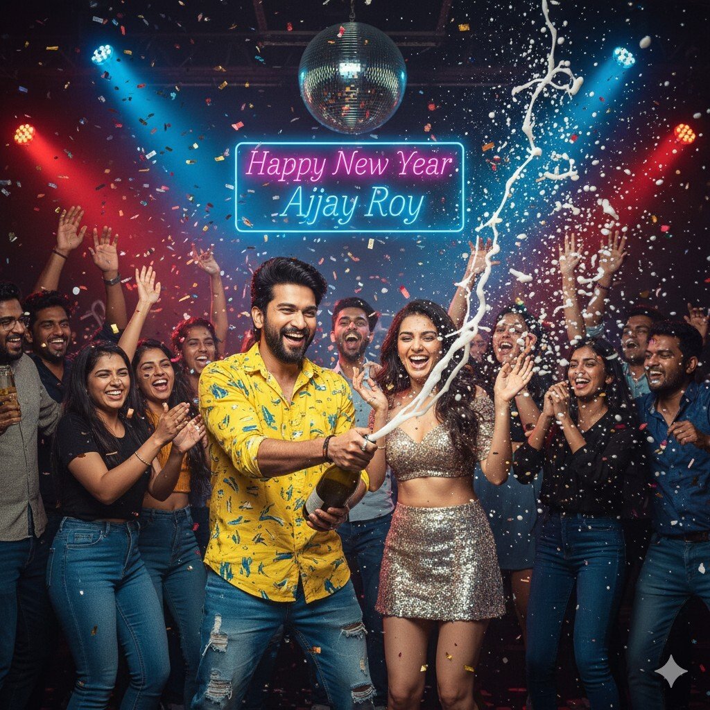 A lively New Year 2026 party in a high-end nightclub. In the center, a young man with the exact facial features and hairstyle of the man in the first image is wearing a bright yellow printed shirt and ripped jeans. He is smiling and opening a champagne bottle with foam spraying. Standing next to him is a young woman with the exact facial features of the woman in the second image, dressed in festive party attire. In the background, a cheering group of friends are dancing under colorful strobe lights and a disco ball. A glowing neon sign above them reads 'Happy New Year Ajay Roy'. Confetti is flying through the air, creating a high-energy, festive atmosphere.