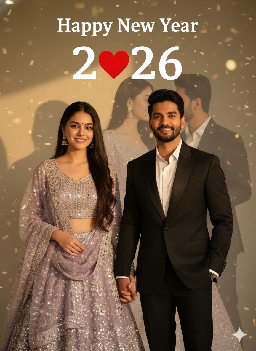 A hyper-realistic 8K cinematic DSLR photo of 100% matching my face as same as picture"A romantic portrait of a couple, with a large "Happy New Year 2026" text overlay in white, where the "O" is a red heart. In the foreground, a man in a black suit and a woman in an elaborate lavender lehenga with intricate embroidery hold hands and smile at the camera. In the background, a faded, desaturated image shows the same couple in a different pose, looking at each other affectionately. The overall color.