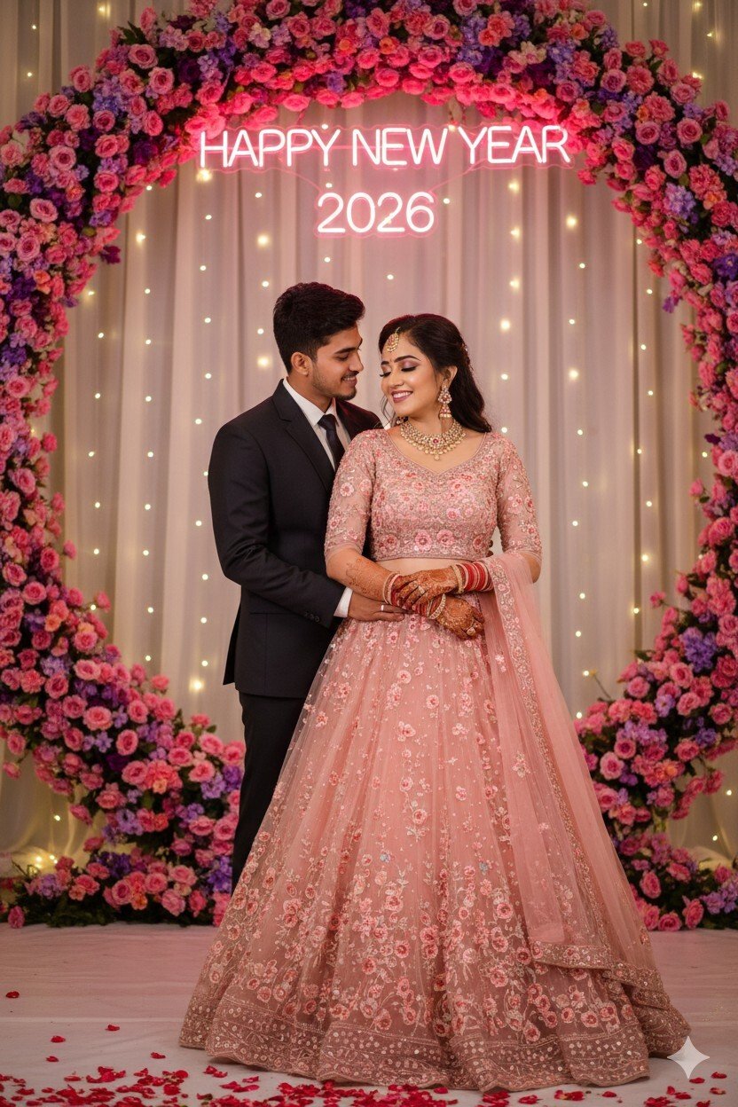 A couple posing elegantly in a party or engagement photoshoot. The man stands closely behind the woman, looking at her lovingly while she smiles gently with her eyes closed. The woman is wearing a peach-pink embellished gown with floral embroidery and net fabric, along with jewelry and mehndi on her hands. The man is in a dark formal suit with a tie. The background features a large circular floral arch made of pink and purple flowers with warm bokeh lights, soft stage lighting, and flowers on and text in Big and capital letters "Happy New Year 2026" neon pink light and stylish font.