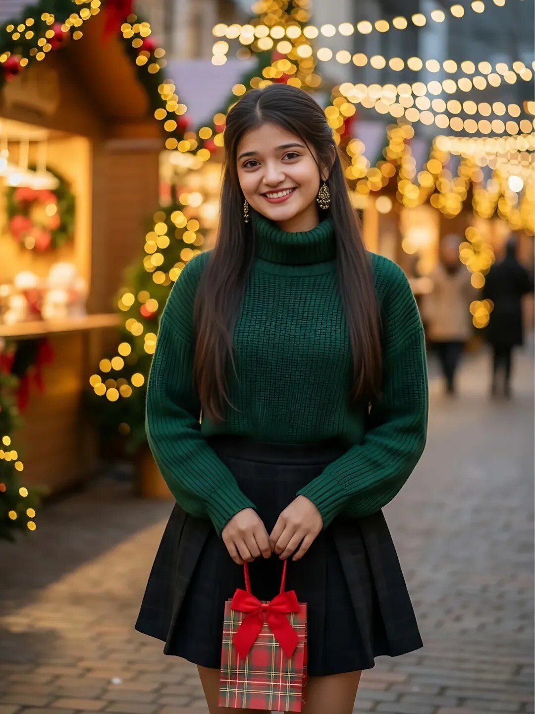 A beautiful young woman standing in a festive Christmas street market, soft golden bokeh lights in the background, decorated shops with garlands and glowing ornaments. She is soft smile, wearing a dark green knitted turtleneck sweater and a black pleated checkered skirt. She carries a small plaid gift bag with a red bow. Long straight brown hair, natural makeup with red lipstick, warm skin tone. Stylish gold earrings. Composition: full-body portrait, eye-level angle, shallow depth of field, vibrant holiday atmosphere. Lighting: warm soft Christmas lights, high-quality DSLR photo, ultra-realistic skin texture, sharp details, smooth background blur, 8k, photorealistic, cinematic look. Christmas vibe, the young women's face matches the uploaded reference image.