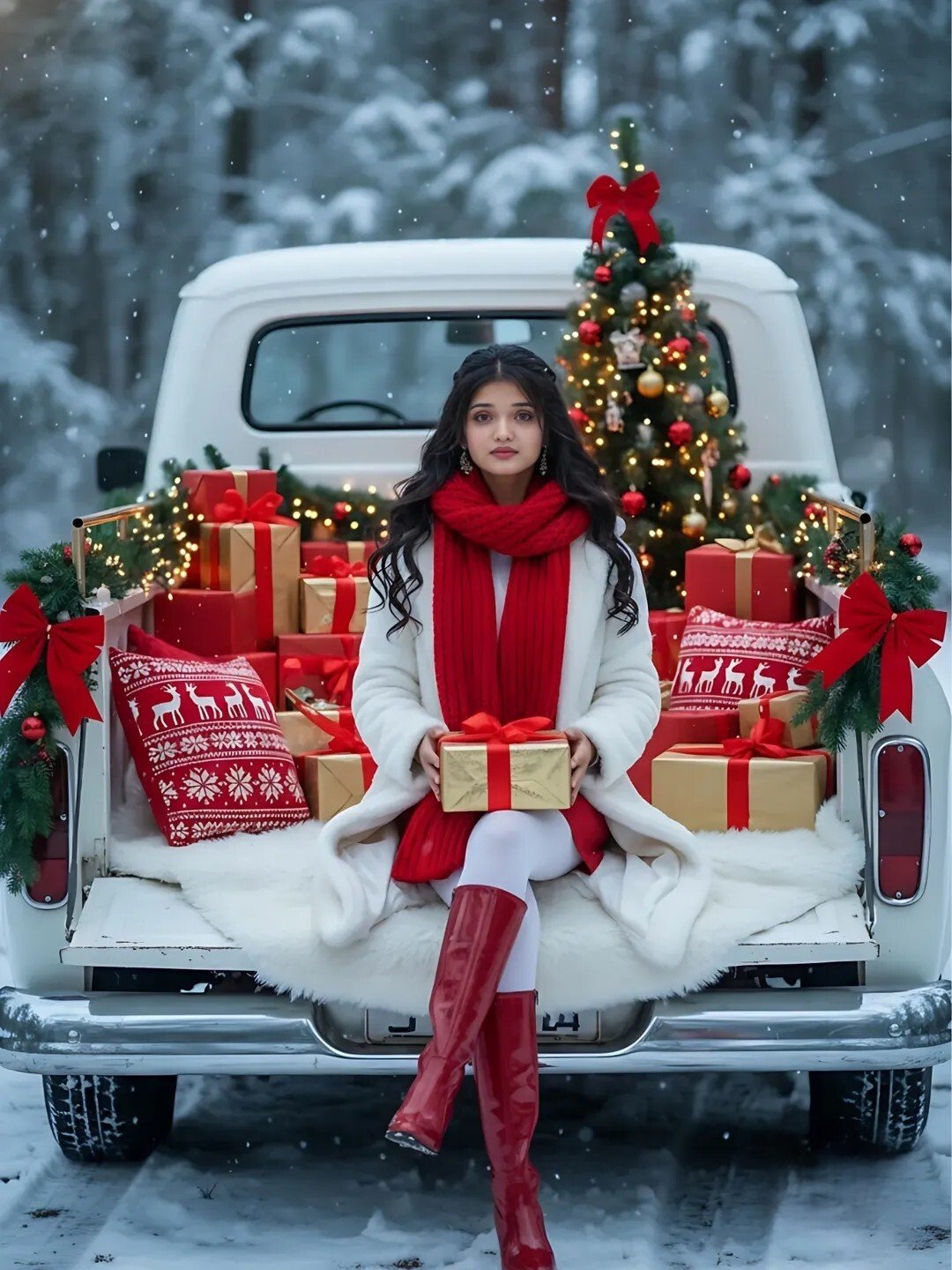 A beautiful young woman sitting on the open back of a vintage white pickup truck decorated for Christmas. She is wearing a long white winter coat, a thick red knitted scarf, white tights, and glossy red knee-high boots. She has long wavy black hair, soft glamorous makeup, and soft smile. She is holding a gold gift box wrapped with a red ribbon on her lap.The pickup truck bed is decorated with Christmas elements: red and gold wrapped gift boxes, small decorated Christmas tree with glowing fairy lights, red holiday pillows with winter patterns, pine garlands with lights, large red bows, and soft white fur blanket covering the truck bed. Snow-covered forest background with falling snowflakes. Ambient soft winter lighting with a cool snowy tone, combined with warm golden Christmas lights. Ultra-realistic 8k, cinematic winter portrait, shallow depth of field, crisp snow details, DSLR-quality lighting, highly detailed textures. the young women's face matches the uploaded reference image
