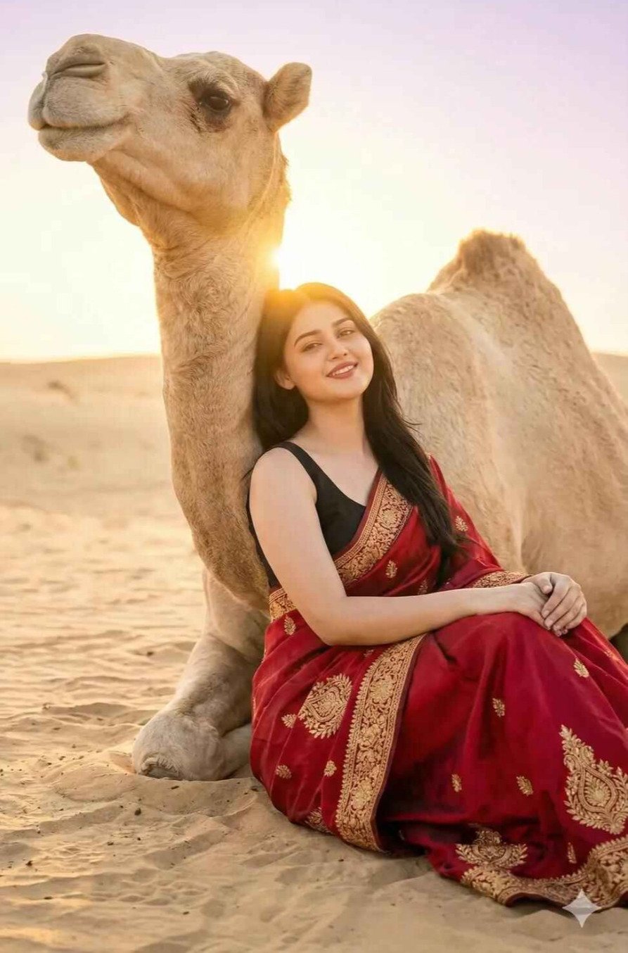 Create an ultra photorealistic Create an ultra cinematic closeup shot of a beautiful indian woman (the reference image uploaded) is sitting gracefully on a sand in desert during golden hour. She is leaning her hands on the backside placed on sand head slightly turning towards camera, She is wearing a black sleeveless blouse with a red silk saree.