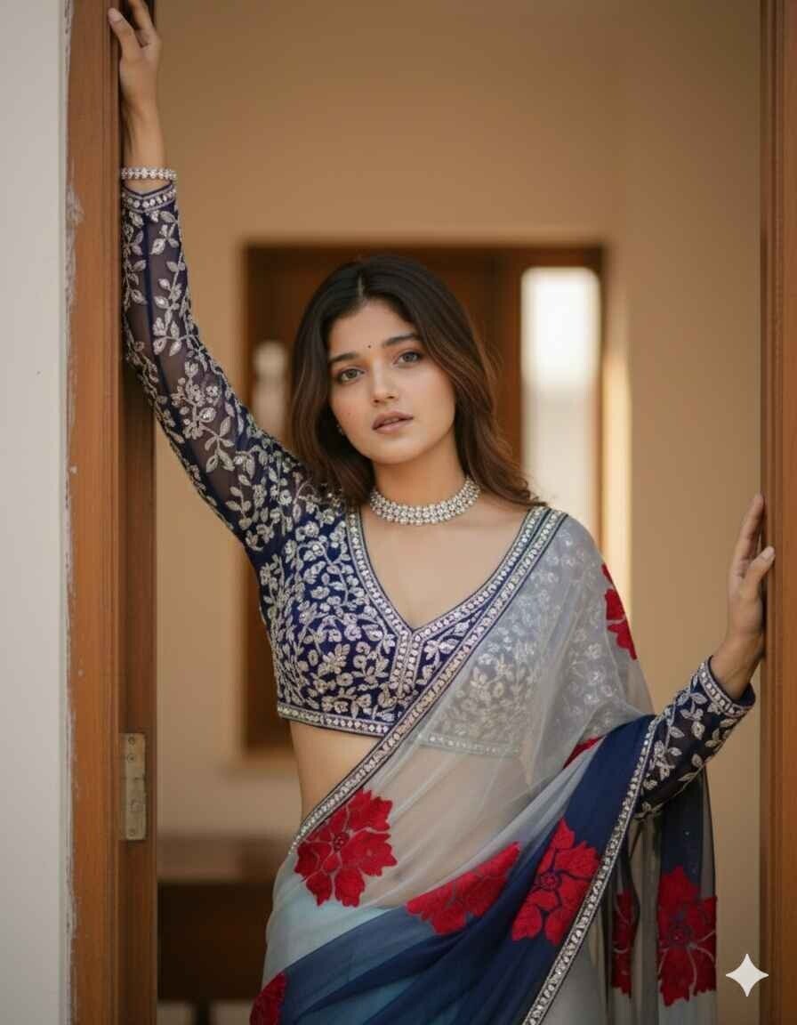 A highly realistic, featuring women standing in the same pose and composition. Beautiful Indian Woman' A long-haired with layered, distressed hair, wearing a deep V-neck navy blue crop top embellished with silver embroidery and faux diamonds, paired silver and Navy blue with a sheer chiffon saree embroidered with large red patterns. She has glossy light-pink lips, smoky eyes, winged eyeliner, gray-blue contact lenses, and wears a matching and diamond necklace, bracelet, fully visual curvy belly