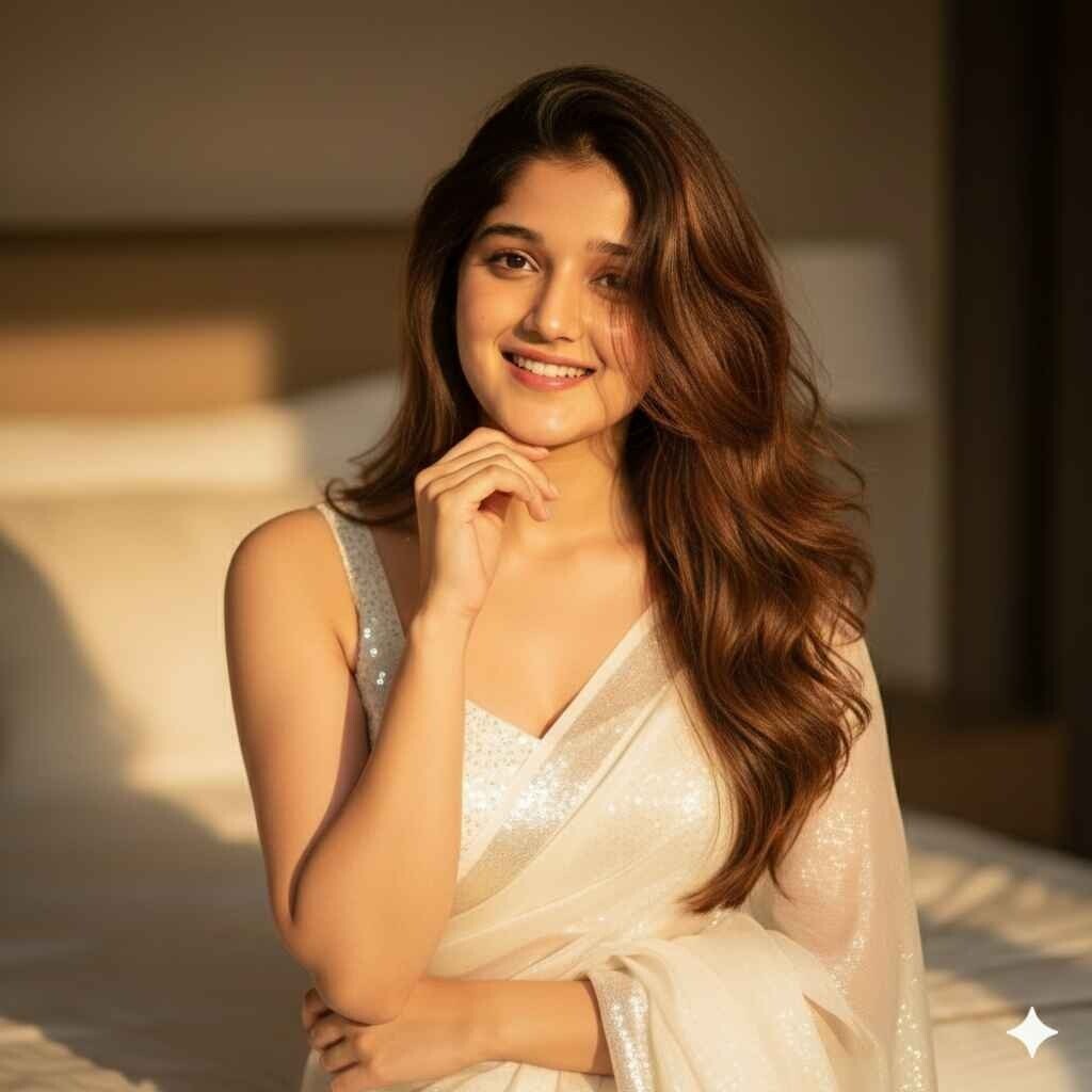Create a hyper-realistic photo is a close-up, tilted at a 45-degree angle. She has beautiful, waist-length, very long brown voluminous hair. Thin, flowing hair slightly covers her face, accentuating her long, curled eyelashes. Her lips are a touch of pink, creating a sweet, dreamy look. She is wearing white shimmer blouse and saree. Give her a stylish pose. Background is blurred inside the bedroom sun rays falling on face keep face same to same.