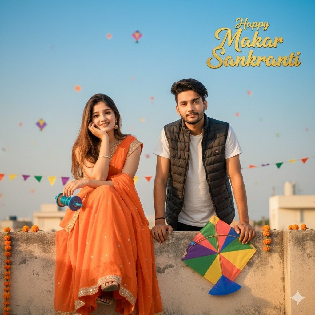 Generate an ultra-realistic scene of a joyful Makar Sankranti celebration on a sunny rooftop. A woman in a bright orange traditional outfit sits gracefully on a low wall, smiling softly with her hand resting on her cheek, holding a blue kite spool in her other hand. Beside her, a man leans forward with both hands on the wall, wearing a white T-shirt layered with a sleeveless black jacket, looking relaxed and calm. A colorful kite lies near his hands.Capture warm sunlight, festive colors, gentle expressions, and the cozy rooftop atmosphere. Add the text ‘Happy Makar Sankranti’ in elegant festive style.