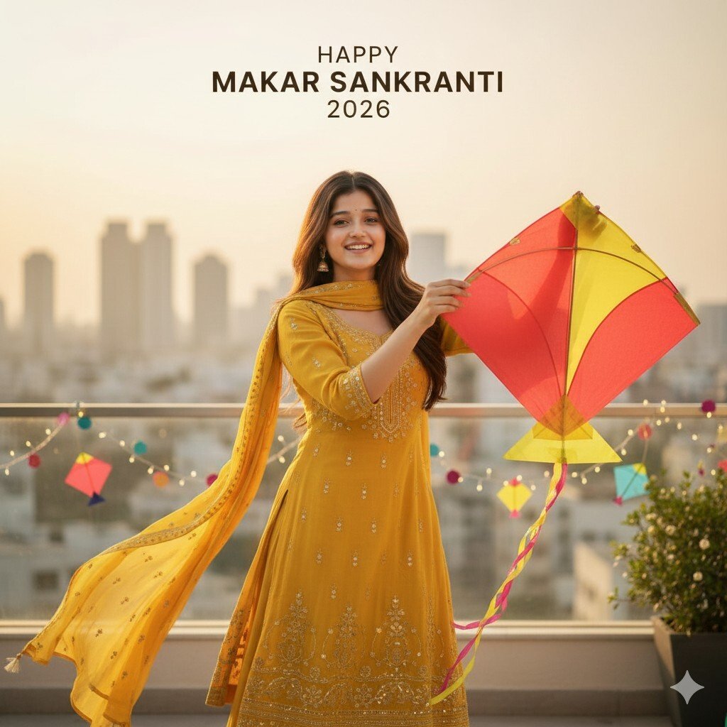 A beautiful Indian girl in a stylish yellow ethnic suit with a dupatta, holding a vibrant red and yellow kite. She is standing on a modern apartment terrace with a detailed city skyline in the background during golden hour. The scene features festive decorations like fairy lights and small kites, a joyful smile on her face, capturing a contemporary Makar Sankranti celebration vibe. Photorealistic, high resolution, with the text 'HAPPY MAKAR SANKRANTI 2026' elegantly written in the sky.