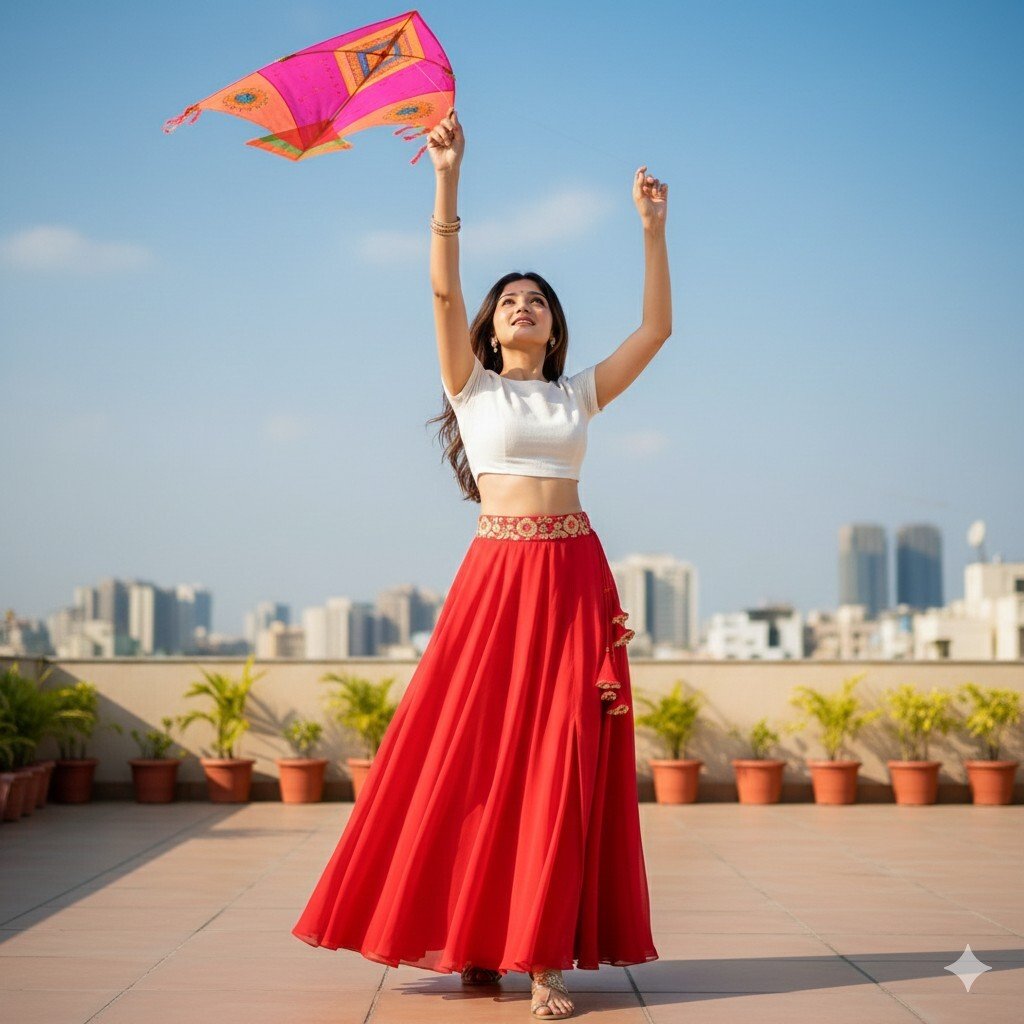 A realistic high resolution lifestyle portrait of a young Indian woman standing on a modern urban rooftop terrace during daytime. She is flying a colorful traditional kite, holding the kite string high above her head with both arms fully raised, creating a joyful and festive pose. The woman is wearing a stylish white fitted crop top with short sleeves, paired with a flowing bright red long skirt (lehenga-style) made of lightweight chiffon fabric, featuring a front slit and an elegant golden embroidered waistband with floral motifs.She has a slim and graceful body, smooth medium-fair Indian skin tone, long dark brown hair left open naturally, soft makeup with natural pink lips, well-defined eyebrows, and expressive eyes looking slightly upward toward the kite. She is wearing minimal gold jewelry including bangles and traditional sandals.The kite is triangular, vibrant pink and orange with decorative patterns, fluttering in the clear blue sky. The background shows a city skyline with residential buildings, rooftop walls, terracotta floor tiles, and green potted plants placed along the terrace. Bright natural sunlight casts soft shadows, creating a warm festive Indian vibe similar to Makar Sankranti or Lohri celebration.Shot in full-body portrait composition, eye-level angle, DSLR photography style, shallow depth of field, sharp focus, ultra-realistic textures, high dynamic range, cinematic lighting, 8K quality, professional fashion photography, natural color grading.