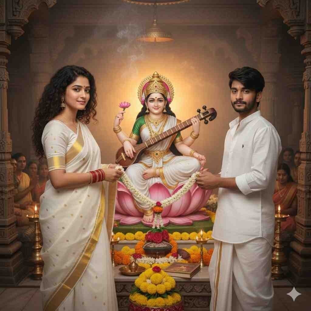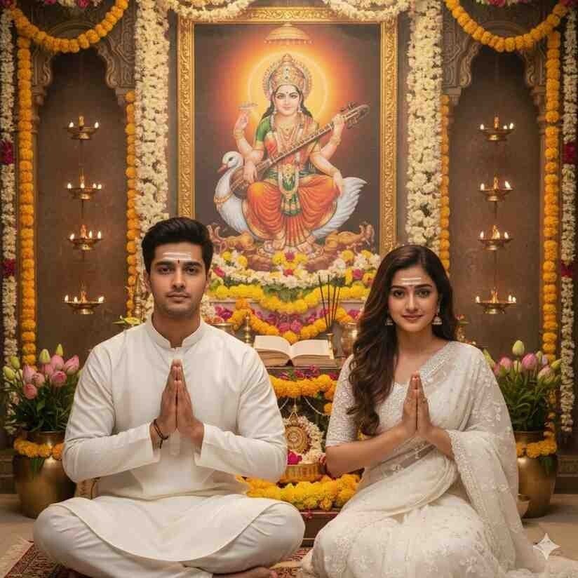 A highly realistic devotional portrait of a young Indian couple seated together in a traditional Hindu temple, performing Maa Saraswati Puja with folded hands (namaste pose).The male is wearing a clean white traditional kurta, calm and devoted facial expression, neatly styled dark hair, light stubble, and a subtle white vibhuti tilak on his forehead.The female is wearing an elegant white traditional saree/anarkali with delicate embroidery, long wavy brown hair styled gracefully over one shoulder, soft natural makeup, expressive eyes, subtle pink lips, traditional earrings, and a matching white vibhuti tilak on her forehead.Both are seated peacefully in front of a beautifully decorated Maa Saraswati idol, placed on a floral altar adorned with white and yellow marigold flowers, lotus flowers, green leaves, books, veena, and traditional puja items. The idol of Maa Saraswati is depicted with fair radiant skin, calm compassionate eyes, a serene smile, holding a veena, sacred scriptures, and seated on a white swan, symbolizing wisdom and knowledge.In the background, a large divine framed portrait of Maa Saraswati glows with a soft golden aura. The temple environment is richly decorated with flower garlands, brass diyas, incense smoke, and warm ambient lighting, creating a peaceful and spiritual atmosphere.The couple is positioned symmetrically in the center, both looking straight toward the camera with devotion and serenity.Shot in ultra-realistic DSLR photography style, medium close-up framing, shallow depth of field, sharp focus on faces and puja elements, cinematic lighting, warm color tones, HDR, 8K resolution, professional devotional photography, spiritual, calm, and divine mood.