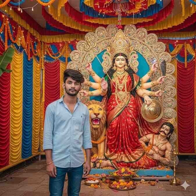 Use the provided reference image for exact facial resemblance and identity preservation.A realistic Saraswati Puja scene inside a beautifully decorated pandal. A young Indian man is standing respectfully beside a grand idol of Goddess Saraswati ji. The man’s face, hairstyle, skin tone, facial structure, eyes, nose, lips, and expression must closely and accurately match the reference image. He is wearing a light blue casual shirt and jeans, standing naturally and looking toward the camera.Behind him, Goddess Saraswati ji is depicted in traditional form with four arms holding Veena, books, rosary, and pot of water, wearing a white saree with golden embroidery, ornate jewelry, and a detailed crown. The swan (vahana) is visible beside her, with books, flowers, and ritual items arranged around. The pandal is decorated with colorful fabrics, floral elements, traditional ornaments, and festive lighting.Bright festival lighting, realistic textures, sharp focus, high detail, authentic Indian Saraswati Puja atmosphere, documentary-style realistic photography, natural colors, high realism, 8K quality.